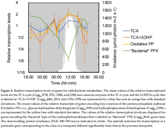 日間高光高氧期(11:00):以光異養代謝為主(利用有機碳源),伴隨固碳基因低表達。