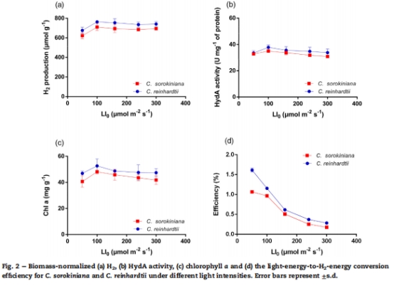 能量轉(zhuǎn)化效率峰值:50 μmol m?2 s?1時(shí)獲得最高光能-氫能轉(zhuǎn)化效率(LHCE)(C. reinhardtii:1.61%;C. sorokiniana:1.06%),隨光照增強(qiáng)而降低(圖2d)。