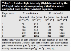 光抑制模型:采用Aiba方程擬合比生長(zhǎng)速率(μ)與空間平均光強(qiáng)(LISA)的關(guān)系(式2),揭示光抑制閾值(C. reinhardtii:186 μmol m?2 s?1)(圖1b)。