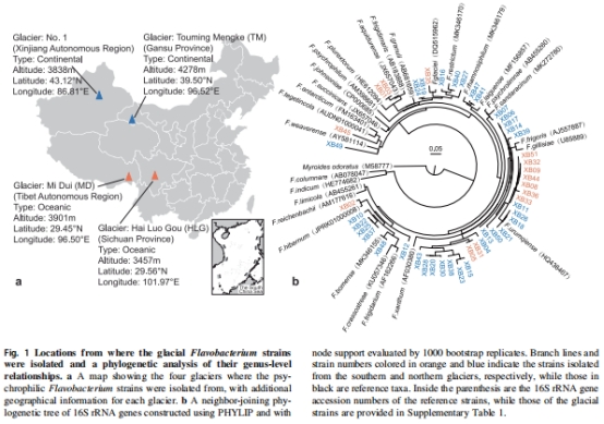 樣本來源:中國4座冰川表層冰(圖1a),分離47株黃桿菌。