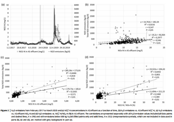 核心發(fā)現(xiàn):芬蘭Viikinm?ki污水廠多條活性污泥(AS)工藝線中,亞硝酸鹽(NO??)濃度異常累積(占NO?-N比例高達(dá)80%),觸發(fā)長(zhǎng)期穩(wěn)定的亞硝化-反亞硝化路徑,導(dǎo)致 N?O排放量達(dá)進(jìn)水氮負(fù)荷的20%(圖1)。