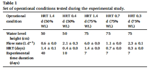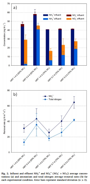 WL 75%:HRT 0.3天時脫氮速率最高(41.9 g N/m3/d),出水總氮16.4 mg N/L。