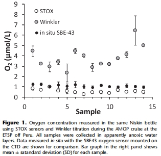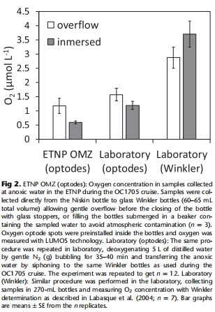 Niskin采樣瓶(PVC材質)會導致缺氧水體(原位O?濃度≈0 μM)的溶解氧濃度升至0.25–0.96 μM(STOX傳感器測量),源于瓶體材料的氧氣滲透(圖1)。