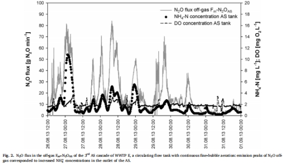 硝化是N?O主要來源:好氧階段N?O排放與進水氨氮(NH??)負荷峰值正相關(圖1-2),尤其在NH??濃度升高時排放激增。