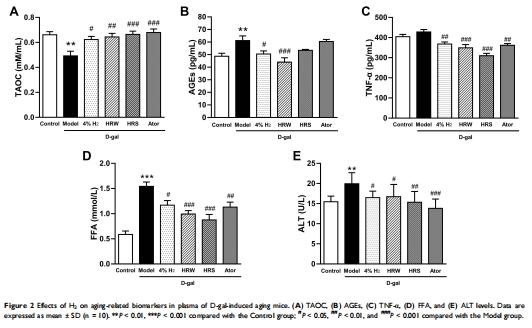 H?顯著改善衰老標(biāo)志物:提升血漿總抗氧化能力(TAOC↑26–35%),降低晚期糖基化終產(chǎn)物(AGEs↓17–28%)、腫瘤壞死因子-α(TNF-α↓)、游離脂肪酸(FFA↓)和丙氨酸氨基轉(zhuǎn)移酶(ALT↓)(圖2)。