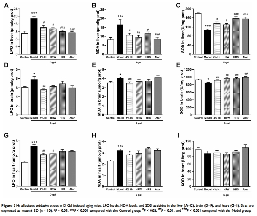 肝臟/腦/心臟中LPO↓、MDA↓、SOD↑(p<0.05),顯示H?直接清除自由基并增強內(nèi)源抗氧化*。