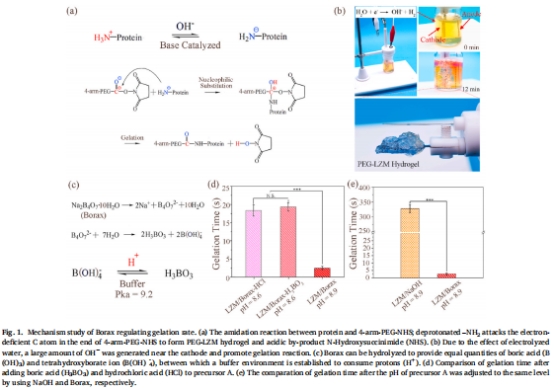 本研究提出一種基于中藥硼砂(Borax)的凝膠動力學調控策略,通過調節酰胺化反應體系的pH環境,精準控制PEG-溶菌酶(PEG-LZM)水凝膠的凝膠時間(3秒至數分鐘),同時保持水凝膠的物理性質(如粘附強度、流變性能)不變。硼砂的加入提供堿性緩沖環境,促進氨基去質子化,加速酰胺鍵形成(圖1)。該策略賦予水凝膠雙重優勢: