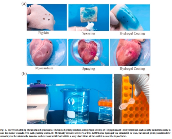 體外模型:噴涂快速凝膠封閉豬心肌出血(圖3a),導管內定制凝膠時間匹配流動(圖3b);
