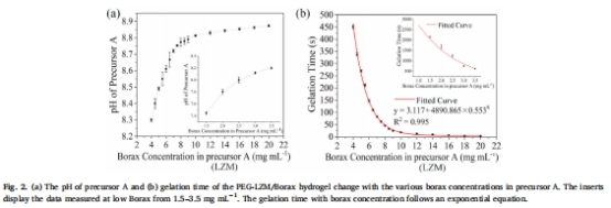 數據:硼砂濃度從1.5 mg/mL增至20 mg/mL → 前體pH從7.42升至8.75(圖2a),凝膠時間從450秒縮短至3秒(圖2b)。
