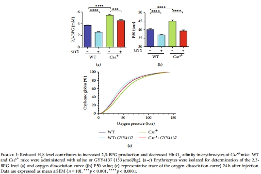 數(shù)據(jù):Cse?/?小鼠紅細(xì)胞2,3-BPG升高40%,P50增加4-6 mmHg(圖1a-c)。