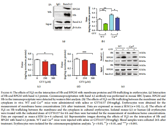 H?S缺失降低修飾水平,增加Hb膜錨定(膜血紅素含量升高,圖6b-d)。