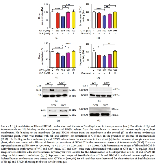 分子機(jī)制:H?S通過(guò)促進(jìn)Hb從膜釋放至胞質(zhì),增強(qiáng)BPGM膜錨定(圖4-6),該過(guò)程與Hb的S-硫磺化修飾(Cys104位點(diǎn))相關(guān)(圖7)。