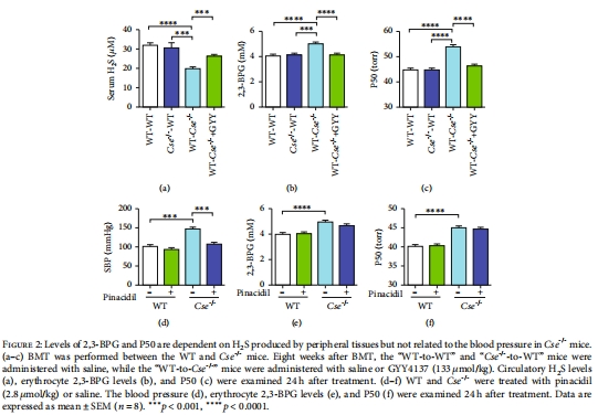 H?S缺失導(dǎo)致2,3-BPG升高:胱硫醚-γ-裂解酶(CSE)基因敲除(Cse?/?)小鼠紅細(xì)胞中2,3-BPG水平顯著增加,50%氧飽和度(P50)值升高(圖1a-c)。