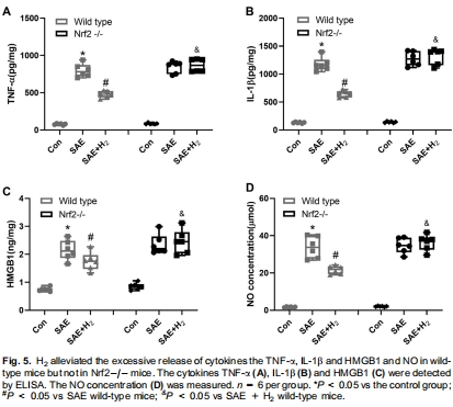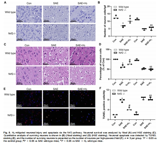 神經(jīng)保護(hù)與認(rèn)知改善:H?降低神經(jīng)元凋亡,改善SAE認(rèn)知功能障礙,且所有效應(yīng)均依賴Nrf2。
