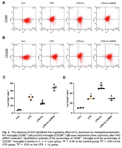 H?促進(jìn)小膠質(zhì)細(xì)胞從促炎M1型(CD86?)向抗炎M2型(CD206?)極化(圖2, 圖6)。
