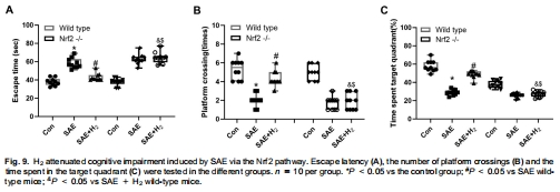 H?使SAE小鼠逃避潛伏期↓40%(圖9A),平臺穿越次數(shù)↑2.5倍(圖9B)。