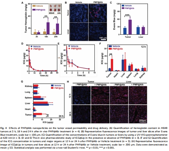 藥物滲透:Evans Blue示蹤血管通透性(圖4B-C);ICG@Lip腫瘤蓄積↑(圖4F-H);