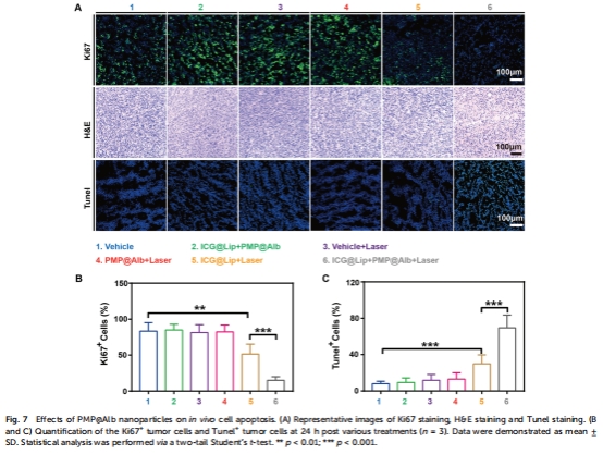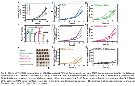 抑瘤率:PMP@Alb+ICG@Lip+激光組腫瘤抑制率95%(圖6H);