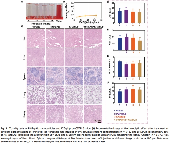 PDT增效:聯(lián)合ICG@Lip(吲哚菁綠脂質(zhì)體)使腫瘤抑制率↑至95%(圖6),且無顯著毒性(圖8)。