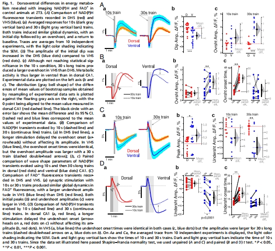 海馬體背側(cè)(DH)與腹側(cè)(VH)在功能上存在差異:DH參與空間學(xué)習(xí)和記憶,VH涉及動(dòng)機(jī)和情緒行為。本研究通過(guò) 離體代謝成像 和 分子傳感技術(shù),揭示了海馬體能量代謝的時(shí)空異質(zhì)性: