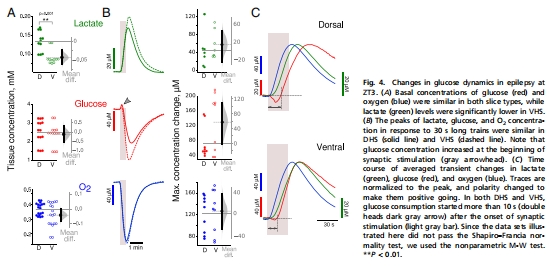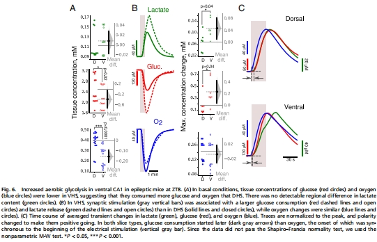 VH低代謝:基礎(chǔ)葡萄糖↑0.7mM、乳酸↓110μM vs 健康(圖4A)→ 癲癇腹側(cè)糖酵解抑制。