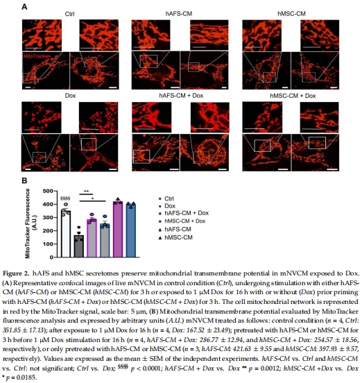 Dox導致膜電位↓50%,分泌組部分恢復(hAFS-CM↑30%,hMSC-CM↑25%)。