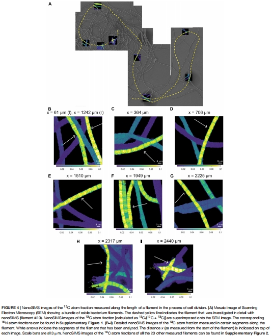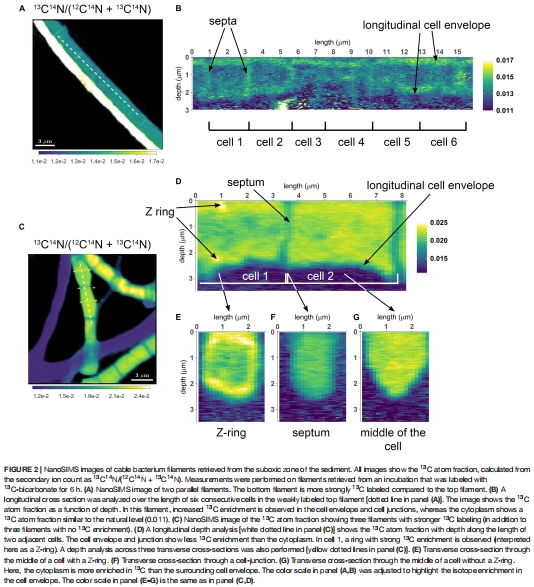 本研究通過結(jié)合雙標(biāo)記穩(wěn)定同位素探測(cè)(13C和1?N)、納米二次離子質(zhì)譜(nanoSIMS)、熒光顯微鏡和基因組分析,揭示了電纜細(xì)菌(cable bacteria)獨(dú)特的細(xì)胞周期與生長(zhǎng)機(jī)制: