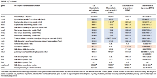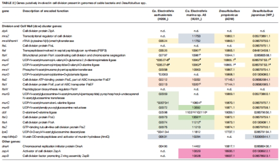 基因組尺度:比對(duì)電纜細(xì)菌與近緣菌(Desulfobulbus)的細(xì)胞分裂基因簇(表2)。