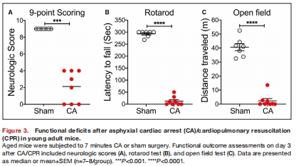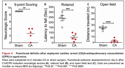 神經(jīng)損傷:CA/CPR后年輕和老年小鼠均表現(xiàn)出顯著神經(jīng)功能缺損(圖3-4)。