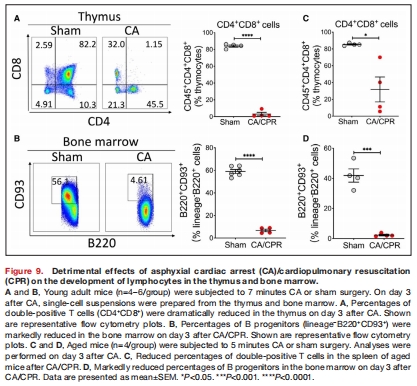 免疫抑制:復蘇后出現(xiàn)急性脾臟和胸腺萎縮(圖6B-C),伴隨嚴重淋巴細胞減少癥(圖7-8)。