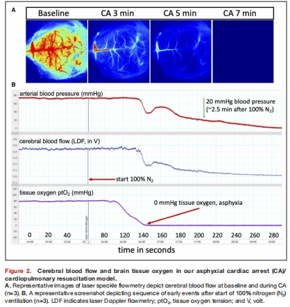 數(shù)據(jù)顯示ptO?在窒息后45-55秒降至0 mmHg(圖2B),而CBF在100秒后才降至0。