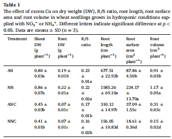 Cu脅迫顯著抑制生長(ANC/NNC生物量↓),但NH??處理(ANC)根系更長、體積更大(表1)。