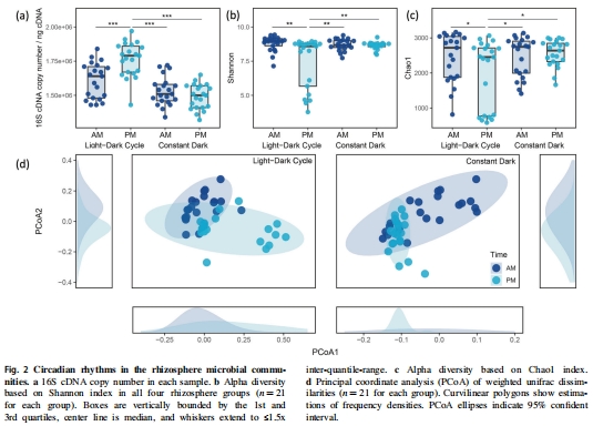 活性:LD組白天微生物活性顯著高于夜間(P<0.001),DD組無波動(圖2a)。