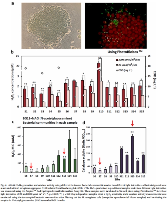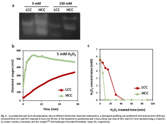 本研究揭示了缺乏過氧化氫酶(catalase)的銅綠微囊藻(Microcystis aeruginosa)依賴共生細菌群落抵御氧化脅迫的機制: