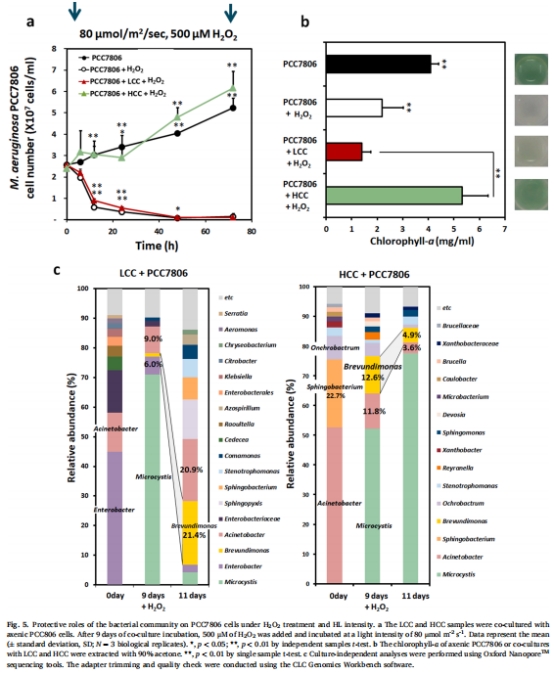 高光照(80 μmol m?2 s?1)誘導銅綠微囊藻產生過量H?O?,導致無菌藻細胞死亡(圖1a),而共生高過氧化氫酶活性細菌群落(HCC)可促進藻生長(圖5a)。