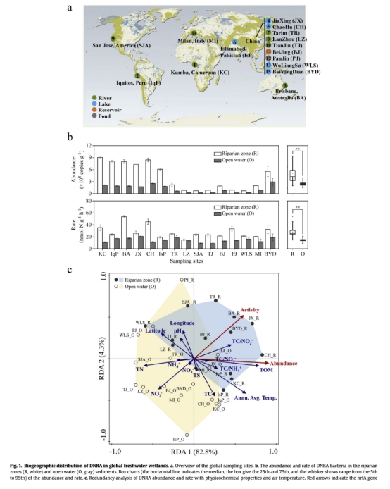 1. 河岸帶為DNRA熱點:全球尺度驗證河岸帶DNRA豐度與速率顯著高于開闊水域沉積物(p<0.01)。