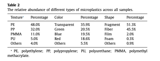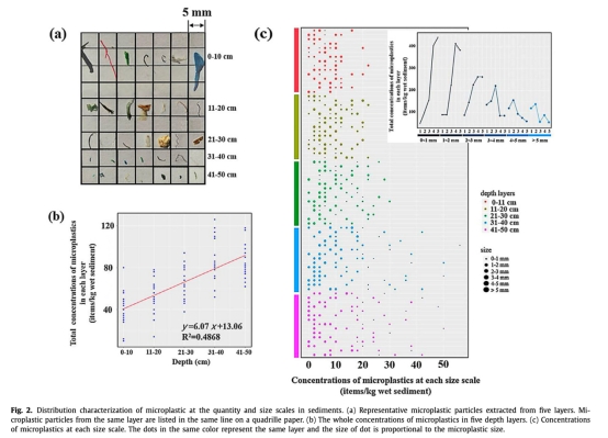 ? 數(shù)據(jù):深層(41-50cm)微塑料濃度最高(46.92±13.34 items/kg),小粒徑(<2mm)占比63.5%;淺層(0-10cm)大粒徑(4-5mm)占40.5%。