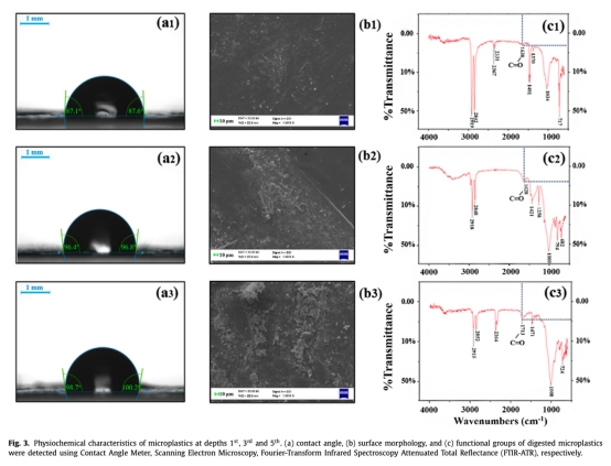 2. 接觸角測量(87.3°→99.5°)、SEM(表面粗糙度增加)和FTIR-ATR(羰基透射率2.8%→4.9%)證實(shí)深層微塑料降解更顯著;