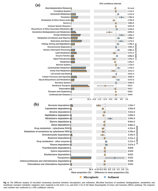 ? 意義:微塑料選擇性富集降解菌,其膜轉(zhuǎn)運(yùn)功能(圖4a)和異源物質(zhì)降解能力(KEGG level 2)更強(qiáng)。