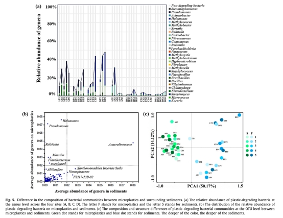 ? 數(shù)據(jù):微塑料表面降解菌豐度(21.37%)顯著高于沉積物(4.33%);PCA顯示兩類群落明顯分離(圖5c)。