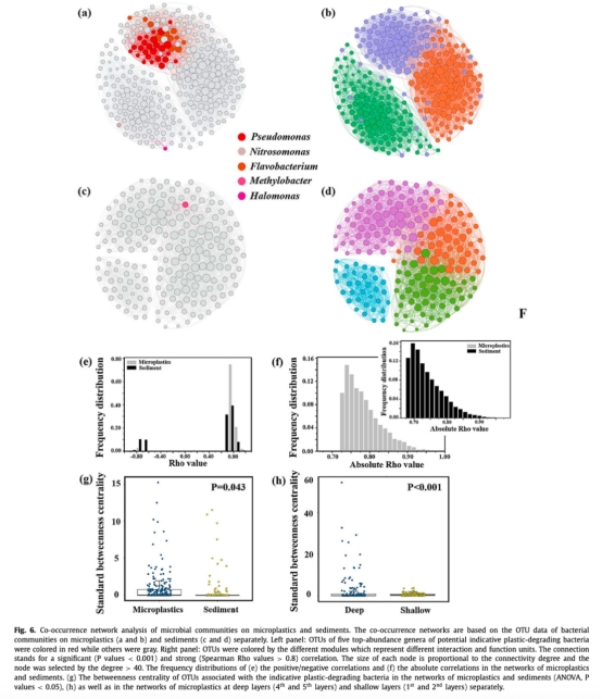 ? 數(shù)據(jù):微塑料網(wǎng)絡(luò)模塊性(0.632)低于沉積物(0.712),正相關(guān)性更高(圖6e-f);降解菌在深層網(wǎng)絡(luò)中心性顯著增強(qiáng)(圖6h)。