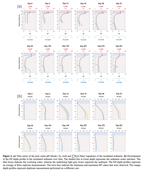 ? 數(shù)據(jù):O?滲透深度從1.1 mm增至9.6 mm;H?S始終<5 μM;pH呈現(xiàn)“表堿深酸”兩極分化。