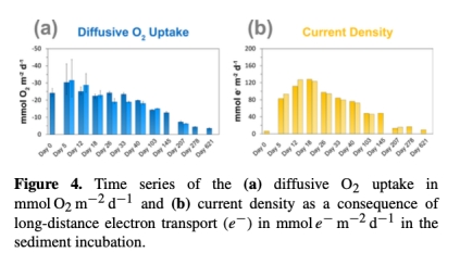 ? EP電極(500 μm分辨率)首次捕獲沉積物內(nèi)電流密度動態(tài)(峰值128 e? mmol m?2 d?1),建立電流密度與O?消耗的定量模型(Fig. 9),為電活性生物地球化學(xué)提供實證。