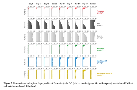 ? 地球化學(xué)響應(yīng):微電極剖面(O?、H?S、pH)、孔隙水離子(Fe2?、Mn2?、Ca2?、HPO?2?)、固相分餾(Fe氧化物、FeS、菱鐵礦)(Fig. 5, 7)。