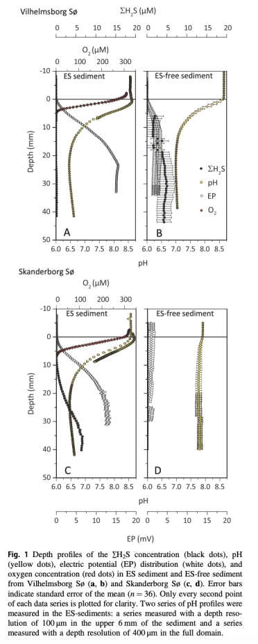 ? 數(shù)據(jù):有氧組EP梯度達15.6 mV(Vilhelmsborg)和12.7 mV(Skanderborg),缺氧組無顯著梯度;有氧組pH呈表堿(~8.6)深酸(<6.5)兩極分化。