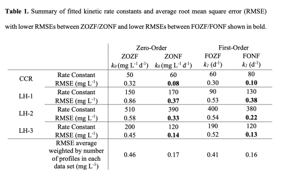 2. 動力學參數范圍:零階速率常數(k?)為50–510 mg L?1 d?1,一階速率常數(k?)為60–400 d?1,與實驗室研究一致。