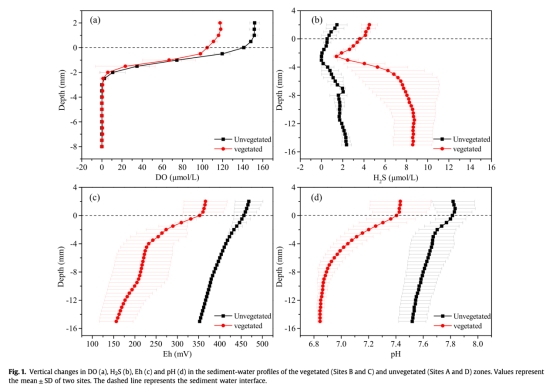 ? 數(shù)據(jù):植被區(qū)DO耗盡深度僅2.5 mm,Eh均值193 mV(vs.無植被區(qū)350 mV),pH降至6.84。