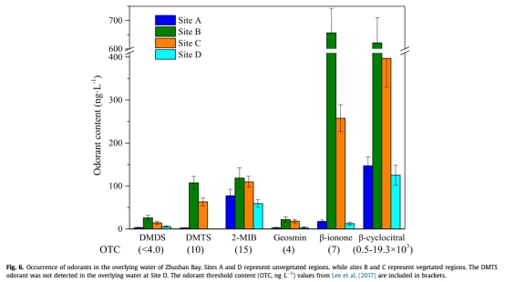? 數(shù)據(jù):植被區(qū)β-環(huán)檸檬醛(307.51 ng·(g·dw)?1)、β-紫羅蘭酮(439.52 ng·(g·dw)?1)含量最高;水體異味濃度與沉積物呈對稱分布。