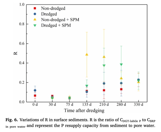 2. SPM的負面影響:外部輸入的SPM富含有機質(OM平均8.81% vs 沉積物6.69%)和活性磷(Fe-P↑67%),其沉積加速了疏浚后沉積物磷活性恢復,通過消耗DO(降至0.61-5.38 mg/L)和提高磷再補給能力(R值↑),增加內源磷釋放風險。