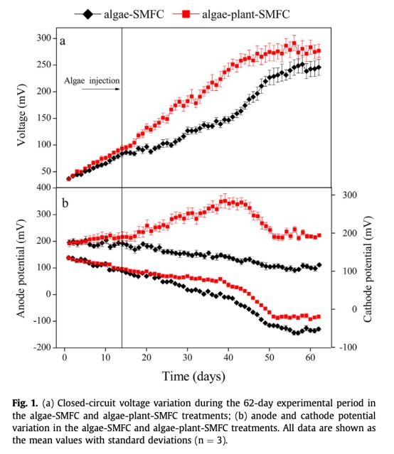 ? 意義:量化SMFC產電性能,揭示黑藻通過維持高陰極電位提升產電(平均電壓181.4 mV vs 137.7 mV),且與藻分解階段相關